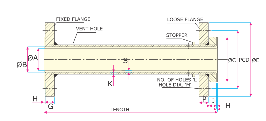 | Size (NB) | øA±1 | øB | øC | PCD | øE | G | No. of Holes | Holes Dia | Pipe THK. K | Liner THK. S | Face THK. H |